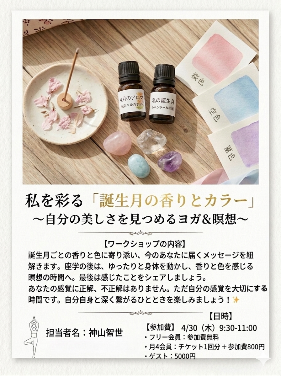 『私を彩る「誕生月の香りとカラー」〜自分の美しさを見つめるヨガ&瞑想〜』